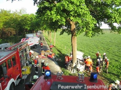 Am 02.05.2018 wurden wir um 06:55 Uhr per Sirene zu einem VUPK (Verkehrsunfall mit eingeklemmter Person) gerufen. Dieser hatte sich auf der Strecke zwischen Vollbüttel und Leiferde ereignet. Wir haben dann zusammen mit den Feuerwehren aus Leiferde und Vollbüttel die Person mit hydraulischem Rettungssatz aus dem sehr stark verformten Auto befreit. Leider ist die Person dann an den Folgen des Unfalls verstorben.