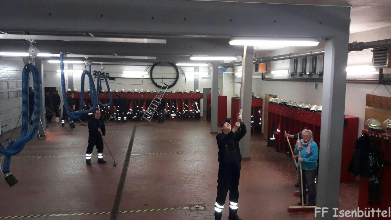 Am 06.03. stand der Reinigungsdienst der Fahrzeughalle auf dem Dienstplan. 13 Kameradinnen und Kameraden haben in zwei Stunden die komplette Fahrzeughalle gereinigt. Es wurden die Spinde abgefegt und abgewischt, und hinter den Spinden wurden die Spinnweben und Wollmäuse aus dem letzten Jahr entfernt. Nachdem die Halle gründlich gefegt wurde, wurde der Boden auch noch mit viel Wasser und Reiniger geschrubbt. Nach getaner Arbeit gab es noch leckeres vom Grill und auch die kühlen Getränke durften hierbei natürlich nicht fehlen.