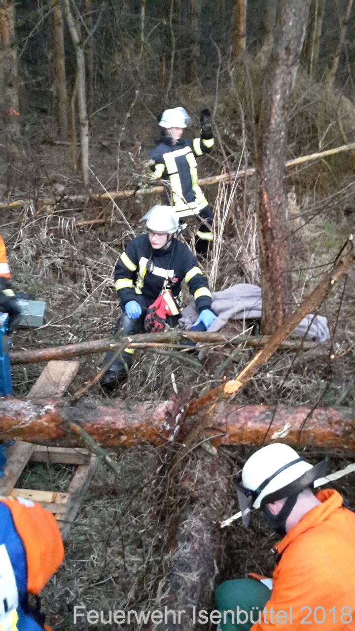 Die zweite Übung fand trotz des einsetzenden Regens am Tankumsee nahe dem Elbeseitenkanal in einem Waldstück statt. Hier wurde bei Baumfällarbeiten ein Waldarbeiter unter zwei Bäumen eingeklemmt. Nach Erkundung durch den Einsatzleiter Karsten Voge wurde umgehend die Rettung eingeleitet. Nachdem die Baumstämme mittels Rüstholz gesichert waren, begann ein Kamerad mit der Motorsäge störende Äste und Kronenteile zu entfernen, um so mehr Platz an der Einsatzstelle zu erhalten. Da ein Waldarbeiter unter Schock stand, verschwand dieser kurz nach Eintreffen der Einsatzkräfte im Wald. Nach kurzer Suche wurde die Person durch die Besatzung des TLF 16/25 hinter einem Wall liegend gefunden und dem Rettungsdienst übergeben. Die Besatzung des LF 16/12 und des RW 2 begannen nach der Sicherung der Baumstämme mit der Rettung des eingeklemmten, mittels hydraulischen Winden und Hebekissen. Ebenfalls wurde die Einsatzstelle mit den Lichtmasten vom LF 16/12 und vom RW 2 ausgeleuchtet. Nachdem die Person gerettet war, fand eine Einsatznachbesprechung mit allen Beteiligten statt.