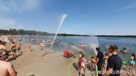 Am 25.07. um 15 Uhr startete der Ferienspaß für uns. Wir fuhren mit unserem Löschgruppenfahrzeug zum Steg für die Rollstuhlfahrer. Dort angekommen wurden wir schon beobachtet. Als wir unsere Pumpe zum Wasser trugen, kamen die ersten Fragen was wir hier machen. Als die Pumpe und die Saugschläuche in Stellung waren, bauten wir einen Monitor (Verteiler mit einem Stützkrümmer und B-Strahlrohr und einem kurzen C-Schlauch) auf. Dann hieß es Wasser marsch und wir richteten das Strahlrohr auf das Wasser auf. Sofort sprangen die ersten Kinder und Erwachsenen darunter und hatten sichtlich Spaß. Zusätzlich schlossen wir noch einen D-Schlauch mit D-Hohlstrahlrohr an die Pumpe an, damit die Kinder auch selbst spritzen konnten. Schon kamen die ersten Erwachsenen auf uns zu und sagten uns: „Es ist total schön, dass ihr sowas macht und das nicht nur für die Kinder, sondern auch wir Erwachsenen haben unseren Spaß“. Da der Wind ein wenig hin und her drehte, gab es auch am Strand ab und an eine kleine Briese Abkühlung.