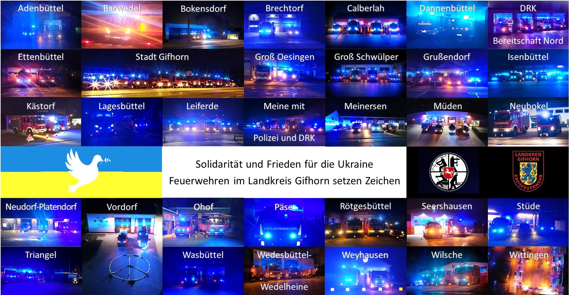 Was für ein Statement: Nahezu alle der 101 Feuerwehren im Landkreis Gifhorn beteiligten sich am Freitagabend an der Solidaritätskundgebung für den Frieden in der Ukraine. Überall im Landkreis leuchteten an den Fahrzeugen die Blaulichter und gelbe Blinklichter: blau und gelb die Landesfarben der Ukraine, um so die Solidarität der hiesigen Einsatzkräfte mit den Menschen und insbesondere den Einsatzkräften in der kriegsumkämpften Ukraine zu zeigen. Auch die Polizei und weitere Hilfsorganisation wie das DRK klinkten sich in die Aktion ein.